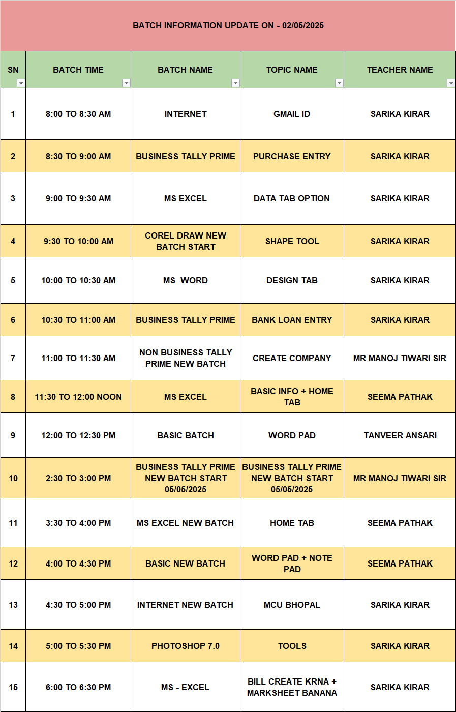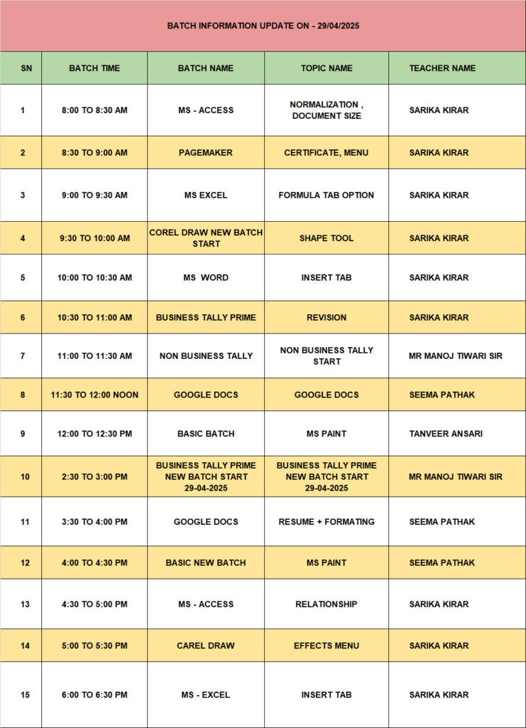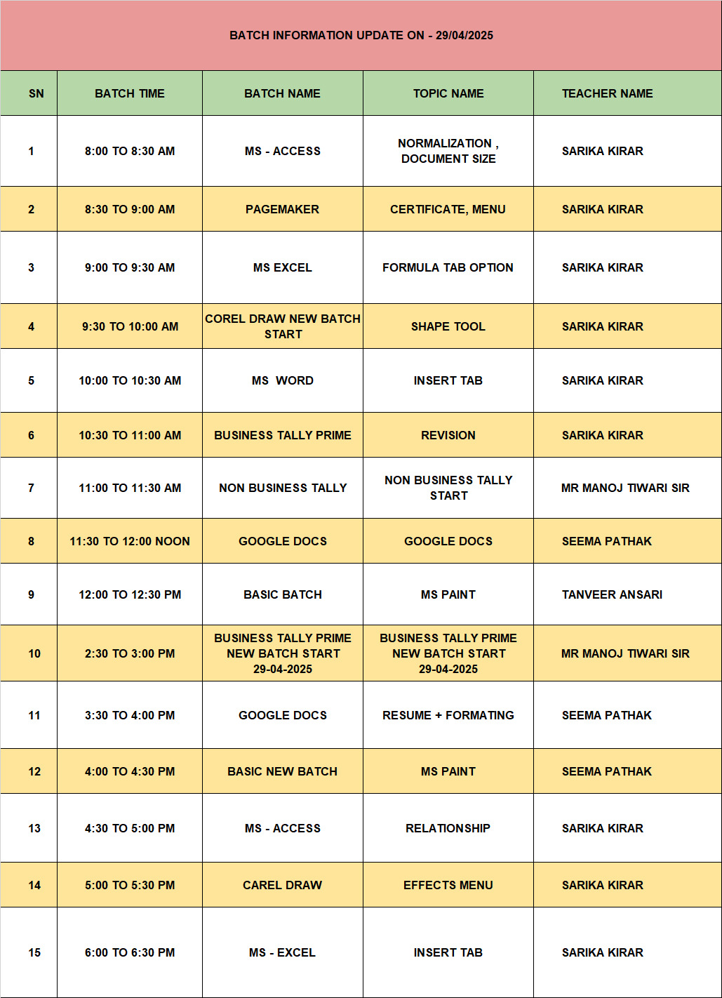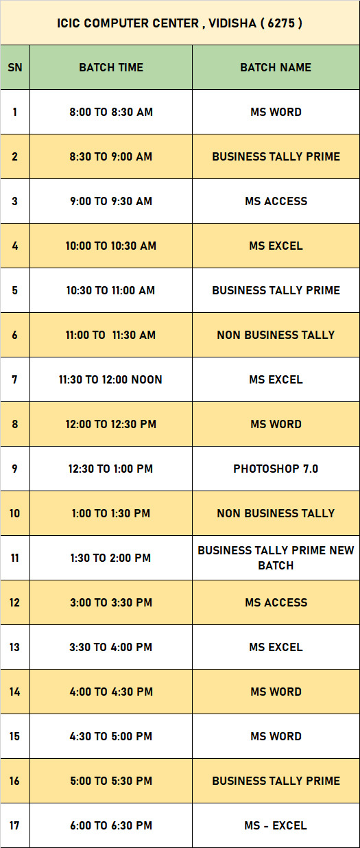 Computer Fundamentals, Windows 7, Office 2010 (Word, Excel, Access, Power Point), Pagemaker, Corel Draw, Photoshop, Tally, Hardware Concept, Internet.